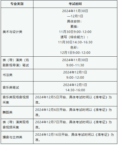 (2)艺术类专业省级统考笔试科目放置正在2024年11月30日—12月1日进行,现场音视频采集科目于2024年12月5日起头。